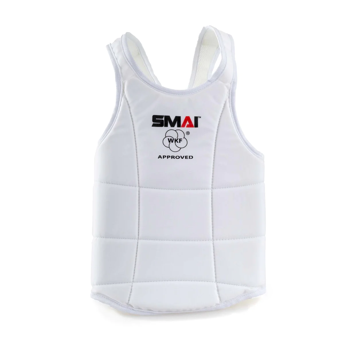 The WKF Approved Body Guard - SMAI has been manufactured for all Kumite and martial arts purposes. Made to World Karate Federation specifications, the WKF Approved Body Guard - SMAI can be used in all WKF events internationally. Chest guard is tested and approved to CE standards EN 13277/1:2000, EN 13277/3:2014 & EU 2016/425.The body guard is suitable for male and female. The ultra lightweight impact absorbing and force disbursing materials give the highest level of protection. A more comfortable fit that allows unrestricted freedom of movement. This model of body protector is the preferred choice of SMAI Olympic Karate Athletes.Designed to be worn under the karate uniform and will not inhibit the natural range of motion of an athlete. All sizes are under 350g.